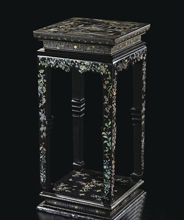 清康熙黑漆嵌螺钿"鹿鹤庆寿"彩蝶花果纹香几,成交价1410万港元,香港苏富比,2012.10.9