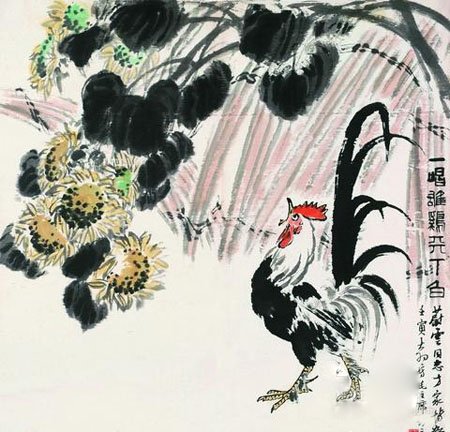 《一唱雄鸡天下白》,110×105cm。此幅作品是陈大羽以毛泽东《浣溪沙·和柳亚子先生》为背景所创作的。该图布局雄奇,线条刚健,造型准确,笔墨酣畅。一只雄鸡矗立于向日葵中,迎初升太阳,仰望长空而引吭高歌,以此来表现新中国农村欣欣向荣和人民斗志昂扬的民族精神和风貌。这也是陈大羽为革新中国花鸟画的大胆创作表现的成功作品。据画家家属回忆,大羽老者一生创作该题材仅三至五幅,一件藏于南京博物院,一件在去年江苏凤凰拍卖以一千三百万元成交,一件即将于嘉信上拍。