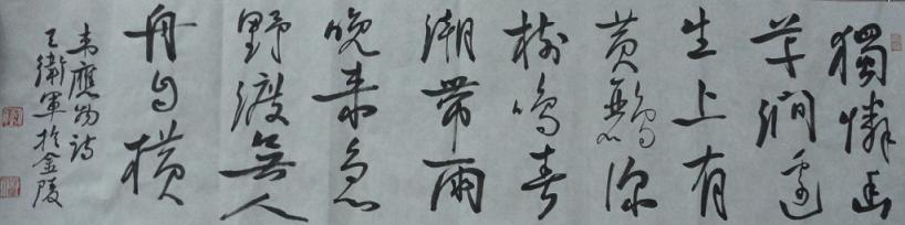 王卫军,1972年生, 男,江苏泗阳人,中国书法家协会会员,江苏省青年书法家协会副主席,国家一级美术师,南京大学艺术学硕士,首届全国“三名工程”书法家,首届江苏省优秀中青年书法家。 现为江苏省文联办公室主任,江苏省文联委员,江苏省青年联合会委员。书法作品获全国第七届书法篆刻展“全国奖”、全国第八届书法篆刻展“全国奖”、全国第三届正书展最高奖、全国第二届扇面展银奖、全军第三届书法篆刻展金奖、第三届中国书法“林散之奖”提名奖等多项全国性大奖。入展首届中国书法“兰亭奖”、第二届中国书法“兰亭奖”、全国当代中青年书家精英人物展、首届江苏省优秀中青年美术家书法家精品展等大展。作品被多家博物馆、美术馆收藏。
