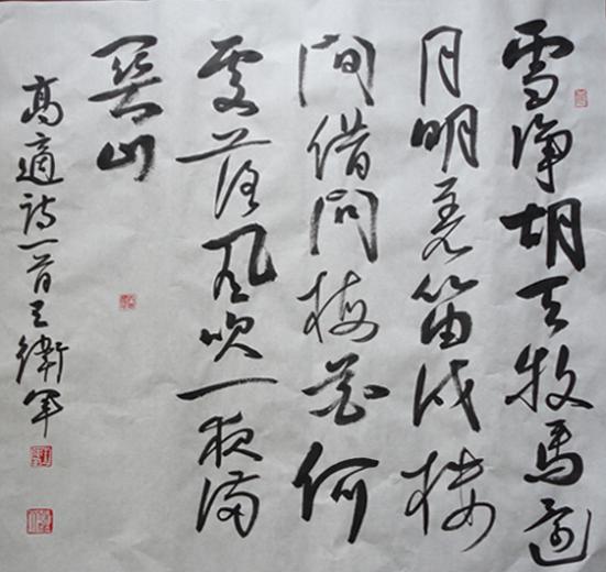 王卫军,1972年生, 男,江苏泗阳人,中国书法家协会会员,江苏省青年书法家协会副主席,国家一级美术师,南京大学艺术学硕士,首届全国“三名工程”书法家,首届江苏省优秀中青年书法家。 现为江苏省文联办公室主任,江苏省文联委员,江苏省青年联合会委员。书法作品获全国第七届书法篆刻展“全国奖”、全国第八届书法篆刻展“全国奖”、全国第三届正书展最高奖、全国第二届扇面展银奖、全军第三届书法篆刻展金奖、第三届中国书法“林散之奖”提名奖等多项全国性大奖。入展首届中国书法“兰亭奖”、第二届中国书法“兰亭奖”、全国当代中青年书家精英人物展、首届江苏省优秀中青年美术家书法家精品展等大展。作品被多家博物馆、美术馆收藏